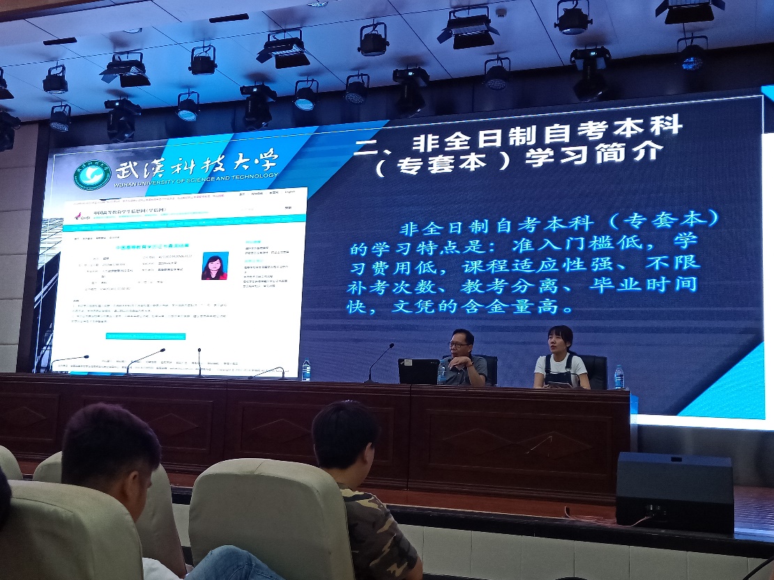 9月25日晚,我院自考辦主任董克斌老師和副主任王新穎老師應邀至湖北城市建設職業技術學院,開展自學考試“專升本銜接”招生宣傳動員工作。湖北城市建設職業技術學院成人教育與中職教育處處長王文坤、成人教育與中職教育處各位老師以及18級全體新生參加了動員會。