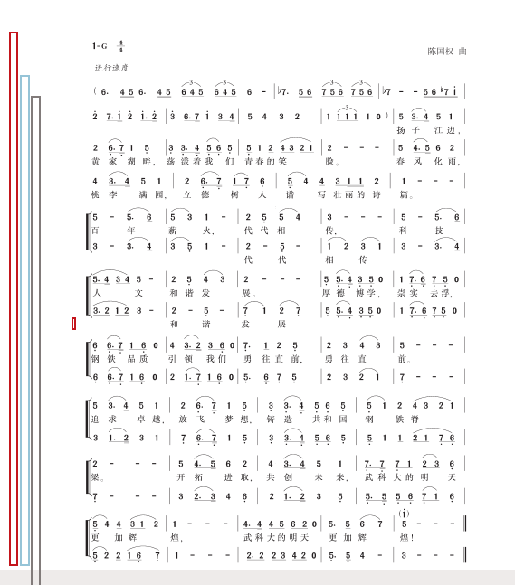 2007年9月,校黨委宣傳部面向全校師生征集歌詞,收到大量脍炙人口的佳作。經過初選、公示,最後選擇了該版由該校師生集體創作的作品。學校特邀全國著名合唱指揮、武漢音樂學院作曲系教授陳國權譜曲,總時長1分35秒。校歌涵蓋了校訓、目标,以及對學校未來的美好祝願。内容豐富,朗朗上口,音律優美而有力。其中“揚子江邊,黃家湖畔”摘自學生的作品。“春風化雨”歌頌老師。“百年薪火”展現我校悠久辦學曆史,“科技人文”講明學校的發展方向,“鋼鐵品質”突出了學校的辦學特色。